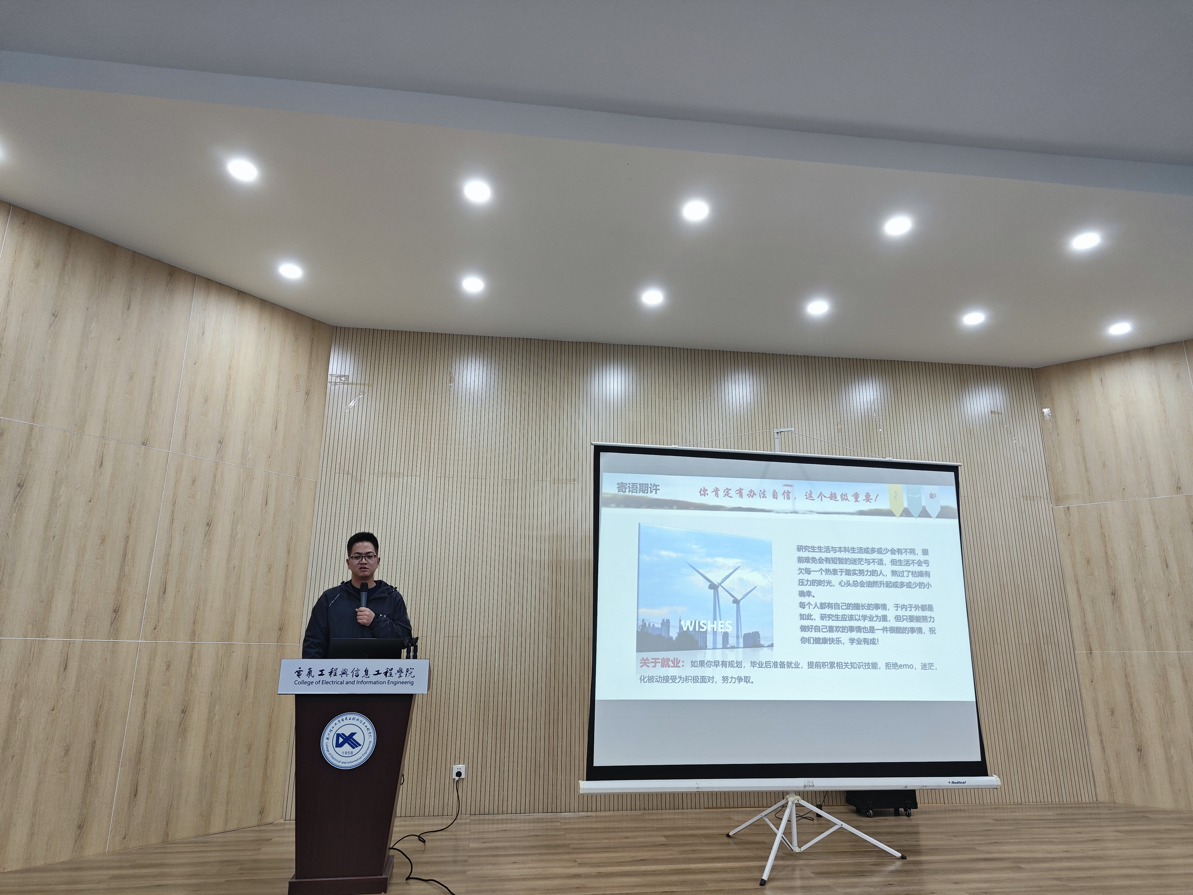 脱奔奔同学从个人经历、科研经验、学科竞赛、校园生活四个方面讲述了研究生三年的成长历程,分享了在面对科研工作时应具有怎样的作风与态度,和现场同学们一起探讨“读好书,告别精神内耗”的问题。脱奔奔同学最后结合自己精彩的校园生活经历,寄语学弟学妹们要相信“不积跬步,无以至千里”,鼓励2023级研究生要迎难而上,不断进步。