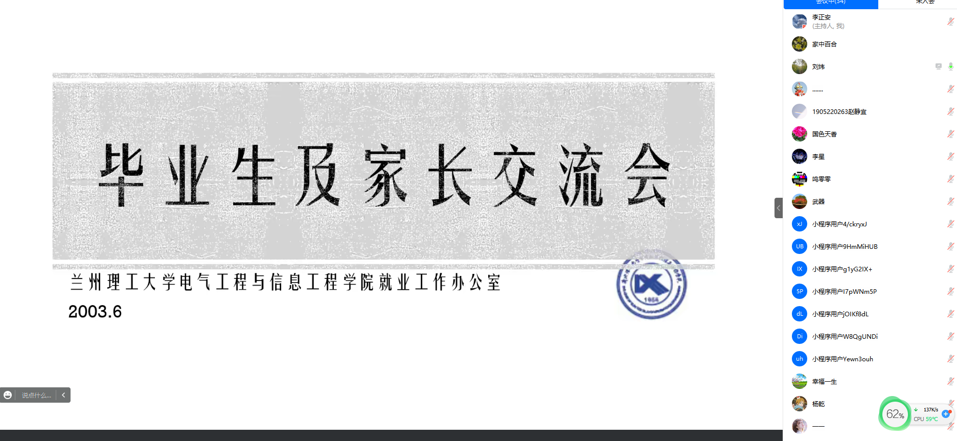 为深入学习贯彻习近平新时代中国特色社会主义思想,落实“三抓三促”行动,进一步扎实推进公司稳就业、保就业,高质量完成2023届毕业生就业工作,7月1日晚,电信公司召开2023届未就业毕业生家长线上交流会。公司党委副书记刘炜、就业辅导员李正安、公司2023届未就业毕业生及家长参加会议。