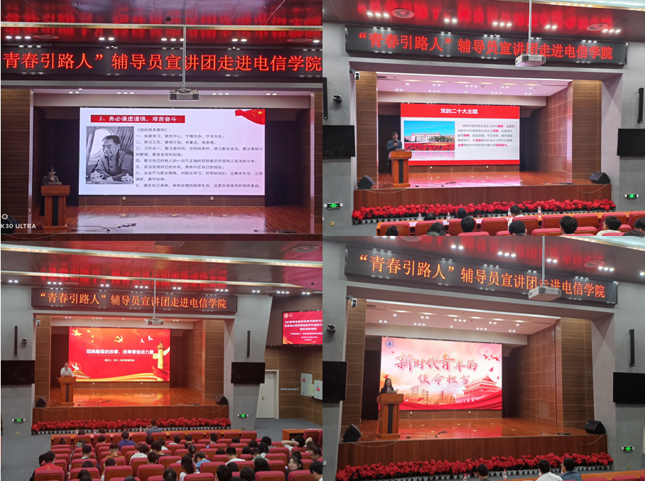 会上“青春引路人”辅导员宣讲团成员、经济管理公司辅导员贾永胜以《奋进新征程 青春正当时》为题,从陈祥榕烈士日记中“清澈的爱,只为中国”出发通过鲜活事例讲述了党的二十大精神。经济管理公司辅导员张凡以《颂典籍里的故事,扬青春奋进力量》为题结合林觉民烈士写下的绝笔《与妻书》,让在场同学感受铁骨铮铮、视死如归的革命精神。石油化工公司辅导员朱建芳以《牢记“三个务必”,践行时代使命,争做时代新人》为题,从“三个务必”的重要内涵和重大历史意义出发,鼓励同学们坚定历史自信、增强历史主动、奋力谱写新时代中国特色社会主义更加绚丽的华章。理公司辅导员翟亚男以《新时代青年的使命担当》为题,从员工志愿者身上发掘优秀事迹,鼓励同学们“青年有担当 国家有力量”。电信公司辅导员成晨以《青春遇见新时代——从三件大事看十年伟大变革》为题,结合十年来对党和人民事业具有重大现实意义和深远历史意义的三件大事,讲述了新时代伟大成就。