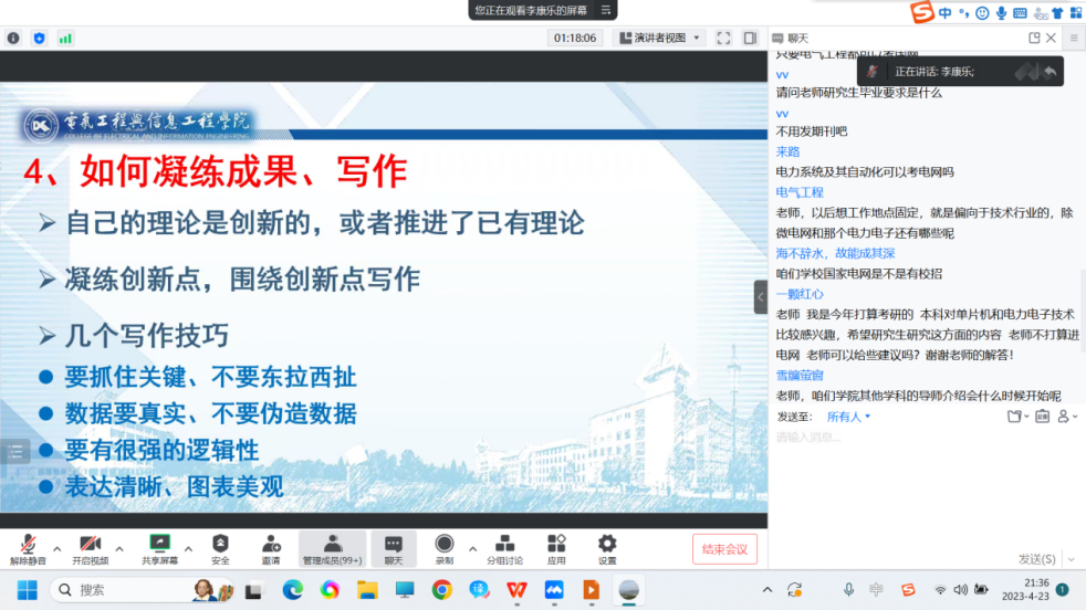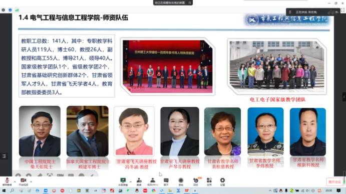 2023年4月23日晚上8.00-9.30,电气工程与信息工程公司电气工程系线上举行了2023级硕士-导师双选会。会议邀请了电气工程系2023级全体拟录取硕士、电气工程系硕士生导师、本校及外校部分大三同学。电气工程系主任张宏亮副教授首先介绍了金沙城js93线路检测中心的基本情况和电信公司的发展历史,然后对电气工程学科和专业建设、团队队伍、实验室条件、创新创业、社会服务和成果转化、研究生报考和录取等情况进行了详细介绍,让拟录取研究生及大三准备考研员工全面了解了电信公司及电气工程系的教学条件、学科实力及发展情况。最后公布了电气工程系硕士生导师联系方式,动员2023级拟录取硕士和导师尽快完成预双选,以便于充分利用好读研前的这段时间,尽早投入到研究生阶段的学习准备中,为三年研究生求员工涯打好基础。