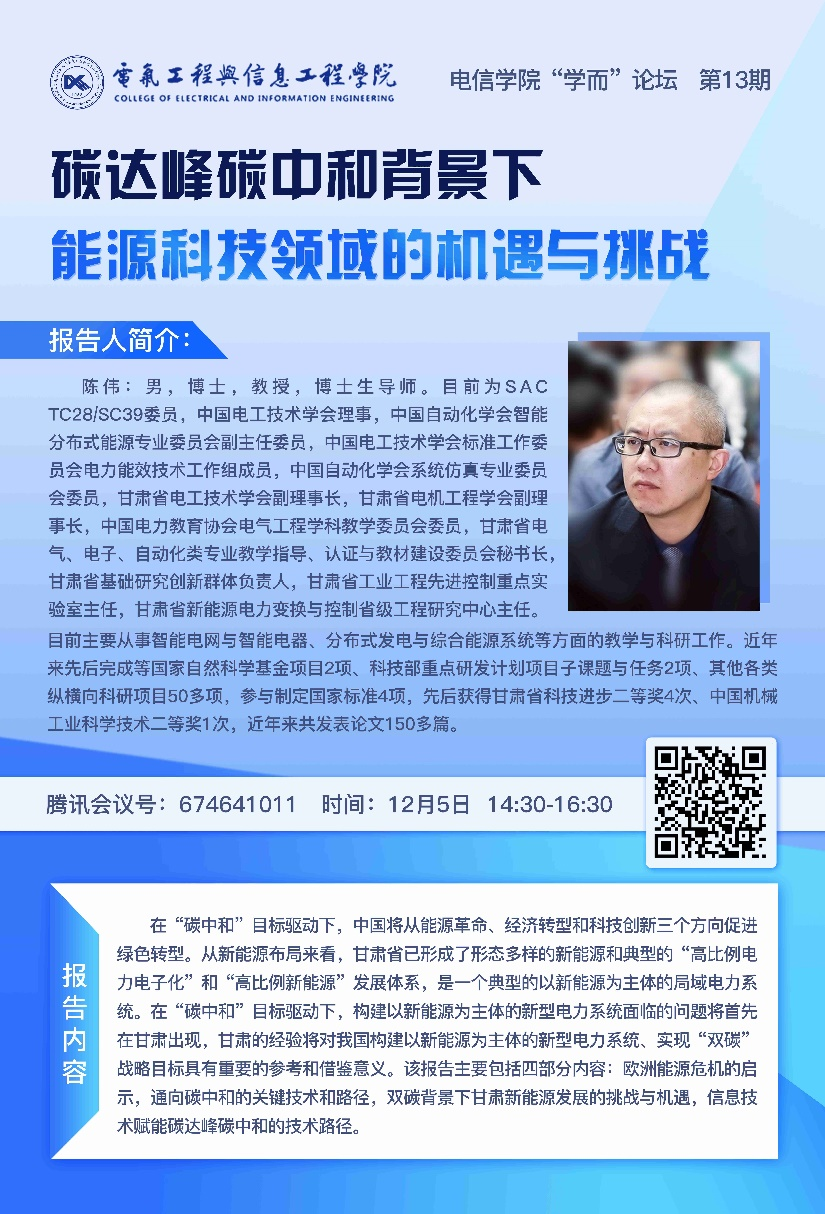 12月5日,由金沙城js93线路检测中心电信公司举办的第13期学而论坛——“碳达峰碳中和背景下能源科技领域的机遇与挑战”在腾讯会议线上召开。会议邀请了电信公司经理陈伟教授作报告,会议由电气工程系主任张宏亮副教授主持。电信公司200余名师生参加了此次学术论坛。