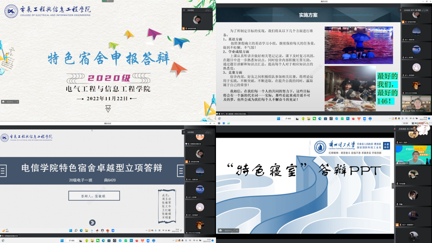 为创造良好的学习和生活环境,深入推进公司“一站式”员工社区建设,着力打造富有特色、体现思政要求、贴近员工实际的生活园区,进一步加强优良学风建设,更好地发挥老员工宿舍文化的服务育人、思想育人、管理育人、实践育人功能,电信公司于11月22日晚开展员工社区“特色宿舍”创建申报立项答辩活动。公司200余名员工代表参加本次活动。此次活动采用线上的方式开展答辩会,寝室立项范围包括学霸型、创新创业型、卓越型宿舍。由参赛宿舍成员进行5分钟的PPT展示,全面呈现出各个宿舍温馨、快乐的真情故事,并提出切实可行的下一步提升方略与实施计划。同学们纷纷表示,今后会继续保持良好的学习生活习惯,坚持积极健康的生活方式,珍惜弥足珍贵的寝室情谊,高度重视寝室安全问题,打造优秀的寝室文化,创建先进文明寝室。