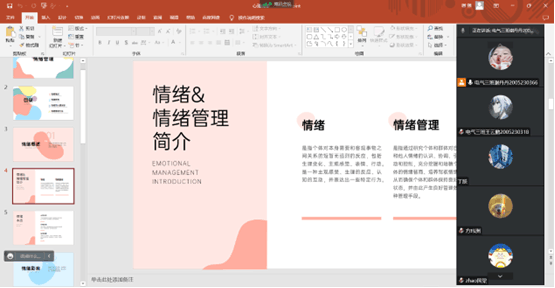 各班心理委员通过PPT宣讲或者观影等多种多样的形式做心理健康知识的普及,并且通过“共同活动,展现魅力”带大家放松心情,“共同活动”中,心理委员引导同学们完成一项共同感兴趣的活动,如“共同打卡美丽校园、共同欣赏一首歌曲、回忆儿时照片”等方式参与活动。各种各样的活动和宣讲形式让同学们体会到了疫情期间的人文关怀。有助于带动同学们的积极性,并提高同学们对心理健康的重视。