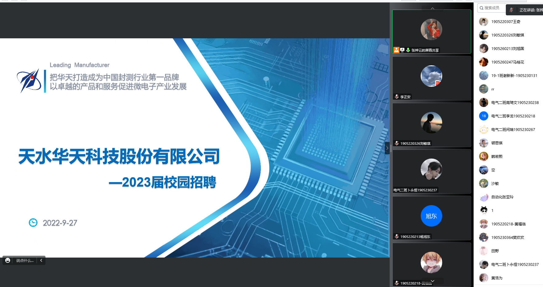 为调动电信公司2023届毕业生就业积极性,拓宽就业渠道,帮助员工成功就业,近日电信公司邀请海康威视、天水华天科技等就业基地单位在腾讯会议平台举行线上就业宣讲会。