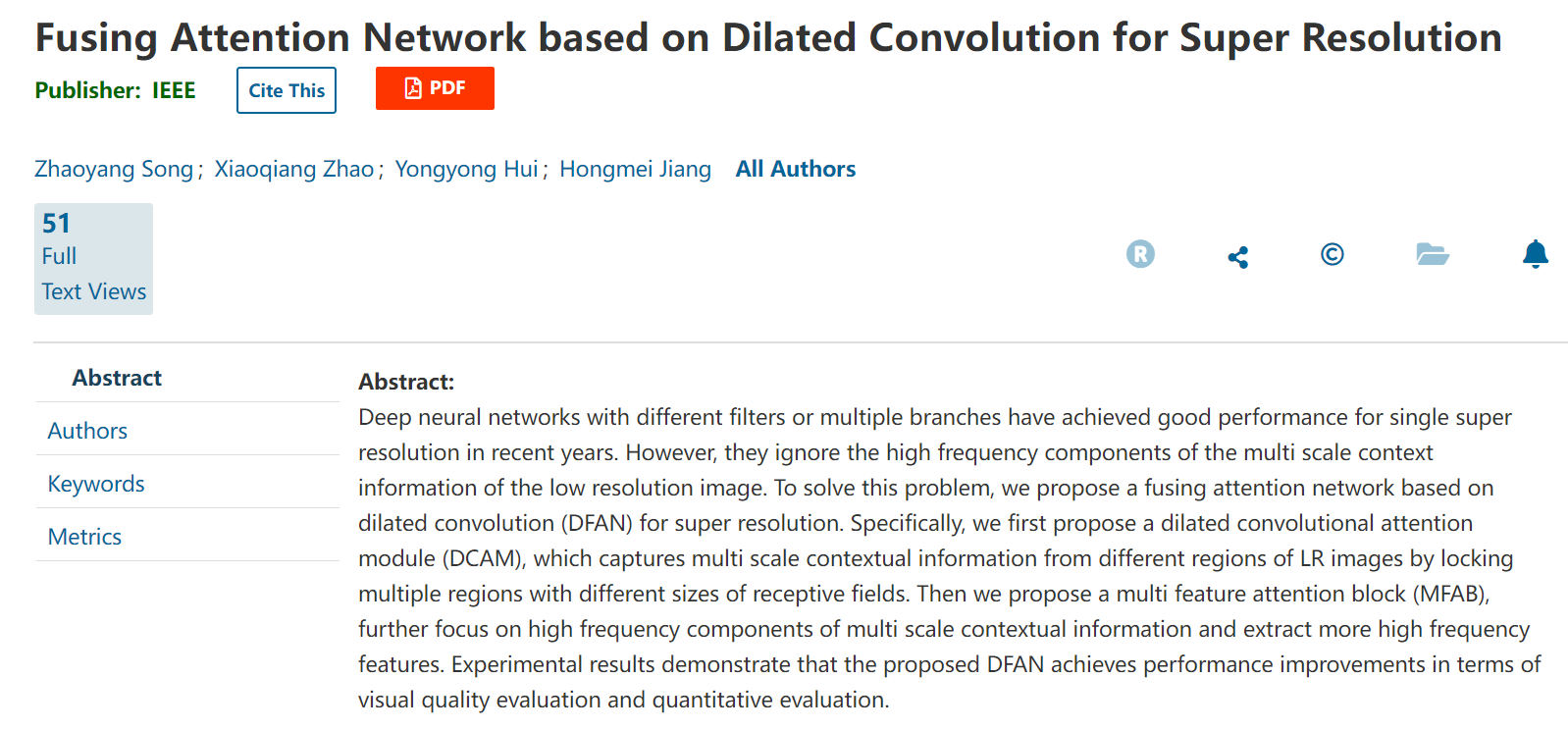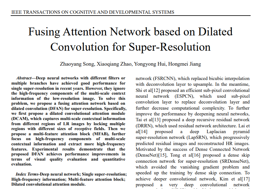 近日,自动化系赵小强教授团队的2020级博士生宋昭漾在自动化学科机器人领域国际权威期刊《IEEE Transactions on Cognitive and Developmental Systems》(高质量科技期刊TI类)发表题为“Fusing Attention Network based on Dilated Convolution for Super-resolution”(Doi:10.1109/TCDS.2022.3153090)(作者:宋昭漾、赵小强、惠永永、蒋红梅)的高水平研究论文。赵小强教授为论文的通讯作者。