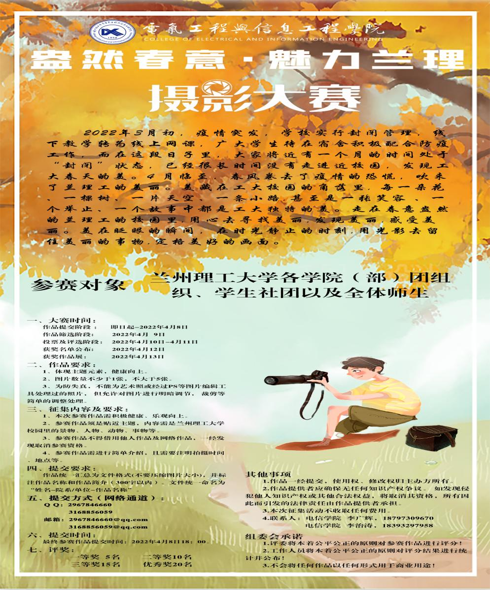 四月将至,一阵春风吹来了兰理工的春色,美藏在工大校园的角落里,每一朵花、一棵树、一片天空、一条小路,甚至是一张笑容、一个举止、一个故事中都是工大独特的美,值此春景,电信公司积极组织开展“盎然春意,魅力兰理”校园春景摄影大赛,鼓励同学们走出宿舍,拥抱自然,热爱生活。