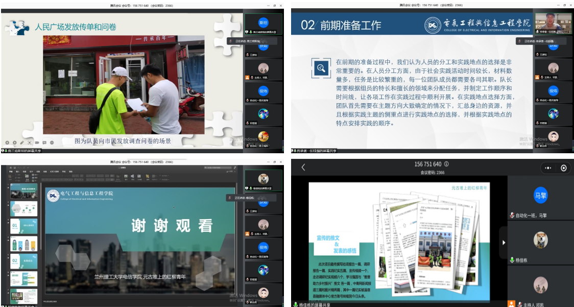 各团队代表成员依次对本团队暑期三下乡社会实践成果进行展示,讲述社会实践的感想和实践过程中的收获。杨家栋同学及他的团队在暑期赴元古堆村开展“科技赋能 乡村振兴”实践项目,通过讲述脱贫攻坚记忆,观察振兴历史成就;调研走访,寻找乡村振兴新变化;科教关爱,引导新生代蓬勃发展;科技赋能,助力特色产业新发展等环节用老员工自己的方式助力乡村振兴。王金鹏同学及他的团队深入甘肃省白银市景泰县,对当地的公司、禁毒机构、村庄、疾控中心等地区进行深入了解调查,弘扬青年服务人民群众的奉献精神,切实提高当地群众对毒品、艾滋病危害的认识和自主防范能力。陈珊珊同学及他的团队重走解放兰州战役路程,前往沈家岭战役遗址进行采风,了解红色文化,传承红色精神。靳治政同学及他的团队前往甘肃会宁重走红色足迹、追溯红色记忆。