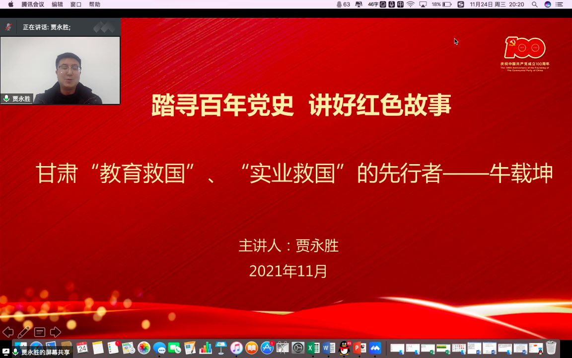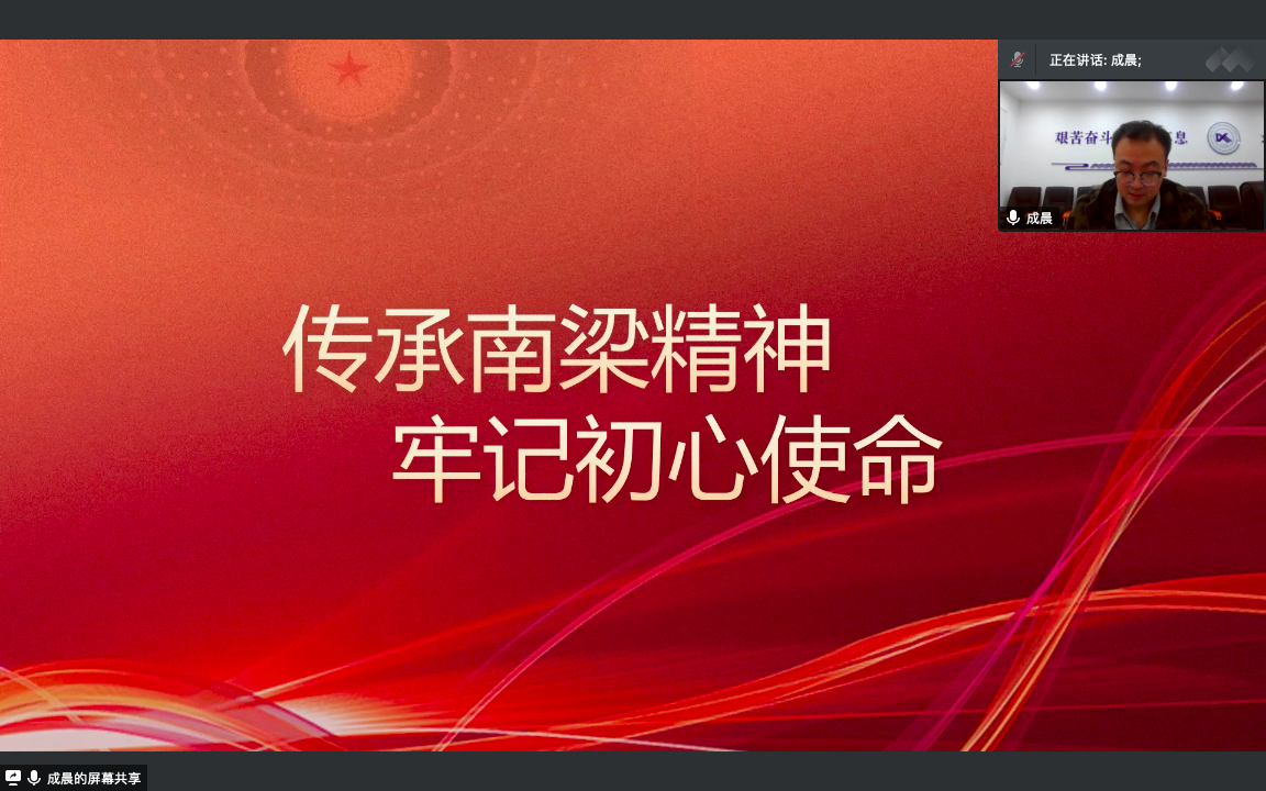 首先,贾老师以“致敬抗疫的兰州·致敬我们的兰州”为主题,通过视频形式回顾金沙城js93线路检测中心志愿者在疫情面前的奋勇拼搏和无私奉献精神,对奋斗在一线的抗疫工作者表达了崇高的敬意。随后,贾永胜老师讲述“教育救国”、“实业救国”的先行者牛载坤先生的故事,牛载坤先生作为金沙城js93线路检测中心的首任董事长,他“少小励志,勤奋好学;实业救国,多方奔走;教育救国,初心不改”的精神,也正是“红柳”精神的彰显。第二阶段成老师以“传承南梁精神·牢记初心使命”为主题,介绍“面向群众、坚守信念、立党为公、求实开拓”的南梁精神。最后,成老师对在场的每一位青年员工提出“脚踏实地、仰望星空”的期望。