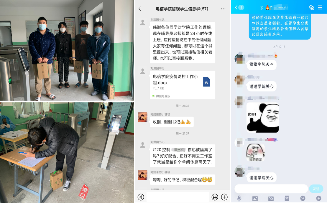 电信公司始终把“暖心服务”融入“硬核管理”之中。公司通过线上疏导等方式关心关注员工,进一步了解隔离员工的生活、学习、心理、身体健康等情况,发放近60箱牛奶慰问隔离同学。公司党委书记王玲、经理陈伟、副书记刘洪国,纷纷嘱咐隔离同学们要保持健康的生活方式,在隔离期间依然要抓紧自己的学业,安全平稳度过隔离时期。并要求员工严格按照集中隔离观察点的工作要求和操作流程,提高防范意识,加强自我防护。公司各辅导员老师每日也通过线上督促、心理健康辅导等方式,保证他们在隔离期间有效学习的同时,感受到爱和关怀。