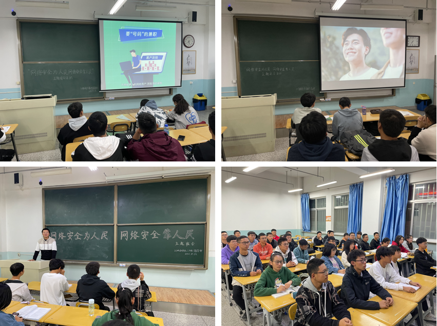 各班级紧扣主题开展班会及主题团日活动。解读网络安全规章制度、讲解网络安全防控故事、普及网络安全知识。组织同学观看了网络安全视频,围绕防盗防骗,人身财产安全等多个方面,列举了网络上存在的风险,并根据相应情景提出解决方案及防范措施。