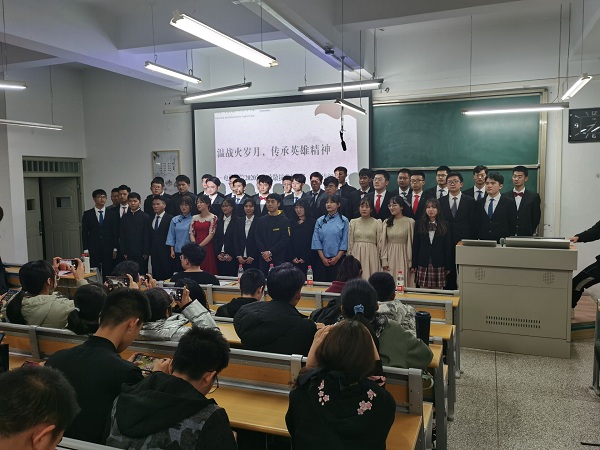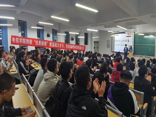为了纪念中国人民志愿军抗美援朝出国作战70周年,大力弘扬爱国主义精神。电信公司11月2日晚于彭家坪校区抒望楼405教室成功举办了“重温战火岁月,传承英雄精神”——“致敬抗美援朝”主题朗诵比赛,来自2020级的11支参赛队伍参加活动,公司辅导员李扬、黄宁老师及三名员工代表组成评委。
