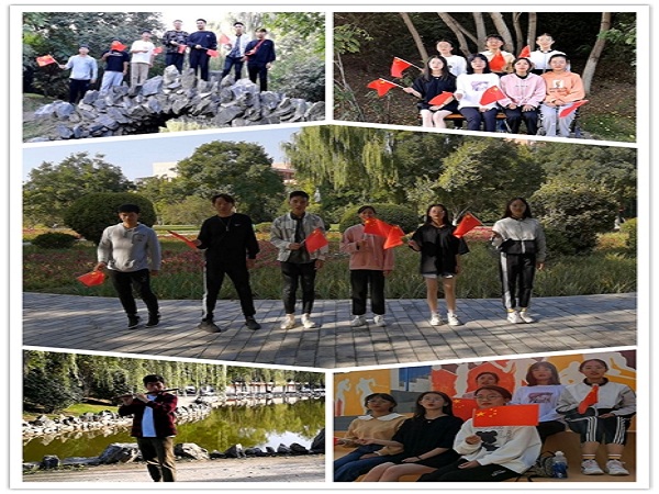 活动中,同学们通过快闪的形式,现场齐唱并录制了歌曲“我和我的祖国”。伴随笛声的响起,同学们轻轻挥舞手中的五星红旗,在校园各处齐唱爱国歌曲,飘扬的国旗彰显着新时代青年的蓬勃活力。歌唱结束后,公司组织开展了“我与国旗有个合影”活动,同学们在问鼎堂门前与国旗、团旗进行合影。