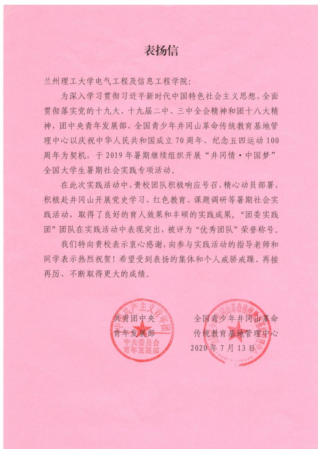 近日,共青团中央青年发展部、全国青少年井冈山革命传统教育基地向金沙城js93线路检测中心电信公司发来信函,表扬公司在2019年“井冈情·中国梦”全国老员工暑期社会实践专项活动的突出表现。