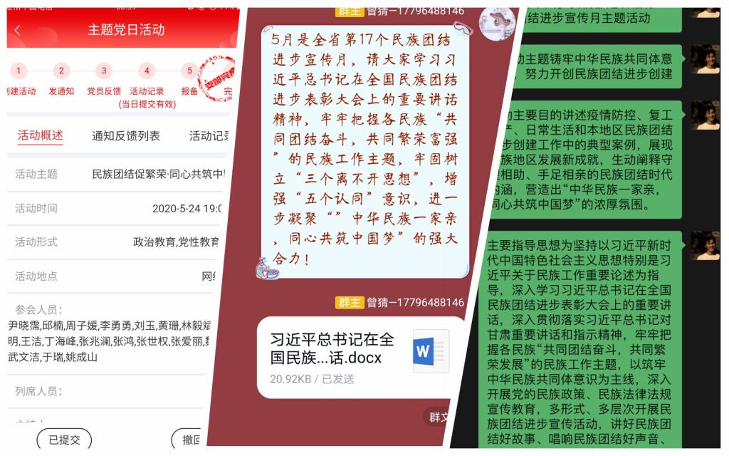 系列活动中,电信公司采用灵活形式开展了丰富多彩的线上主题活动。通过号召各党支部、团支部和班级积极组织开展党日活动、团日活动和主题班会,引导师生深入学习贯彻习近平总书记在全国民族团结进步表彰大会上的重要讲话,进一步提升了公司师生的民族团结意识。各基层组织纷纷开展“民族知识我知道”活动,号召员工集体学习民族知识,2018级自动化2班开展了“五十六个民族是一家”特色趣味活动,要求员工在规定时间内尽可能多的写出我国的民族名称,活动用员工喜闻乐见的游戏形式,有效促进了员工增进各民族感情,加强民族团结意识。