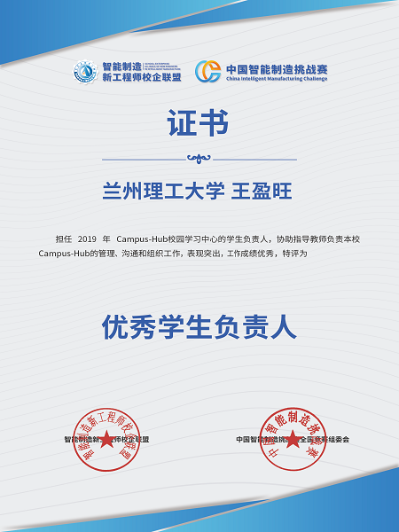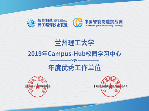 近日公司Campus-Hub校园学习中心(以下简称学习中心)获得智能制造新工程师校企联盟和中国智能制造挑战赛组委会(以下简称组委会)联合颁发的2019年优秀工作单位称号,学习中心负责人王盈旺同学获优秀员工负责人称号,以奖励学习中心在过去一年建设过程中的优异表现。