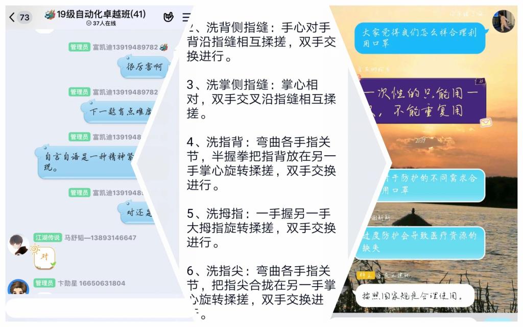 此次线上活动共分为两个环节。通过集中宣传方式,各班级同学一起线上学习了解了疫情期间心理自助与疏导的方法,学会用理性平和、积极向上的态度应对疫情。在班级自选环节,各班级通过“口罩”知多少活动,了解口罩的作用并学习和掌握正确戴口罩的方法;通过健康“手”护神活动,学习“七步洗手法”,养成良好的卫生习惯;通过做情绪小主人活动,学习可以调节情绪、充实生活的小妙招以及有关疫情心理自助与疏导的小知识;通过抗“疫”我知道活动,积极分享自己了解到的疫情小故事,有效地拉近了同学们之间的距离,感受祖国的温暖;通过环保战“疫”在行动活动,积极学习疫请环境保护的相关知识,学习如何防范以及处理疫情期间的环境问题,增强保护环境的意识;通过知法懂法好青年活动,熟悉、了解了新型冠状病毒肺炎疫情防控的相关法律法规知识并分享了学习感悟;通过心理健康知识竞赛活动,有效的检验了同学们的学习效果,同学都非常积极地参与其中。