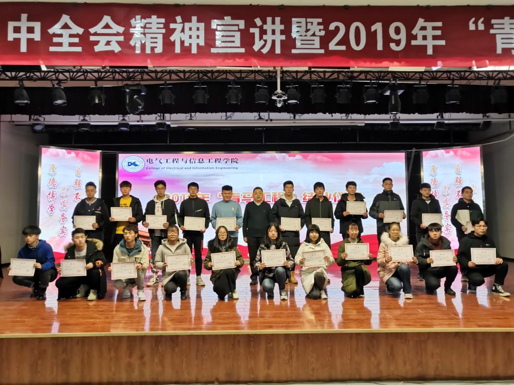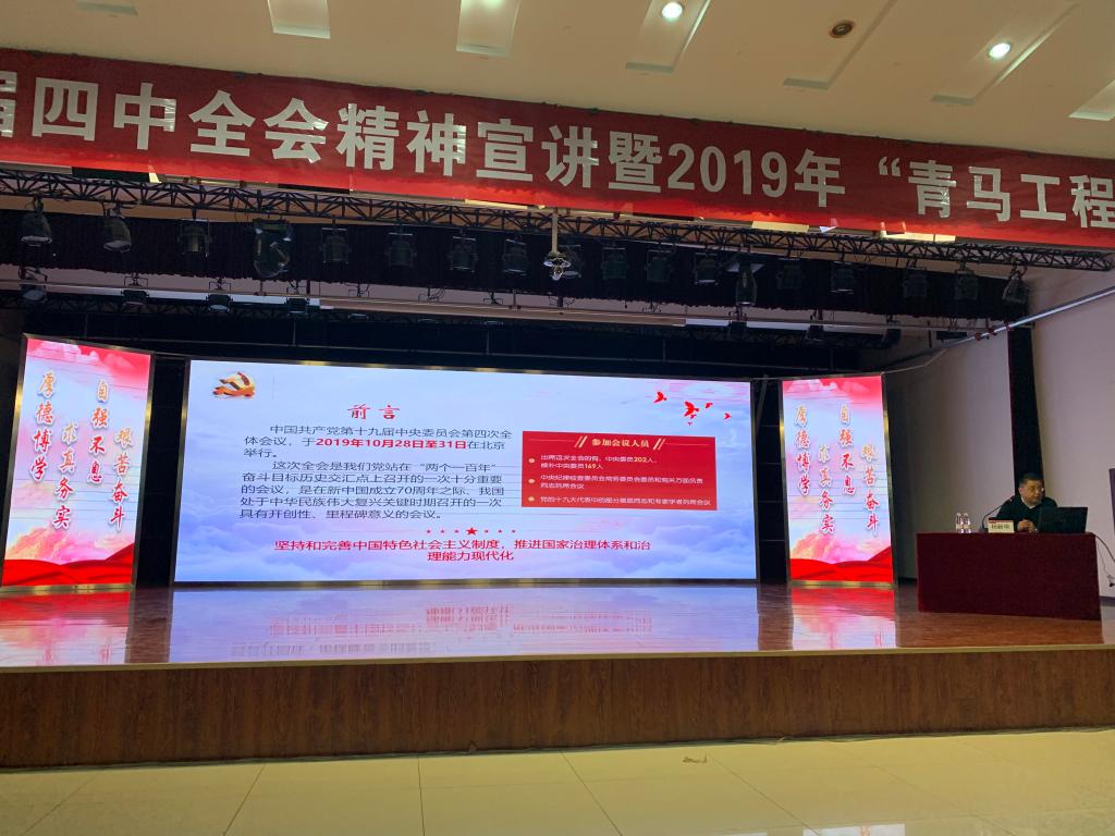 2019年12月10日晚,电气工程与信息工程公司于彭家坪校区老员工活动中心举办十九届四中全会精神宣传暨2019年“青马工程”结业仪式。公司党委书记杨新华、副书记朱毓杰、各年级辅导员以及公司2019 年“青马工程”培训班全体学员、2019 级员工代表共四百余人参加了本次活动。会议由2018级辅导员李婷老师主持。