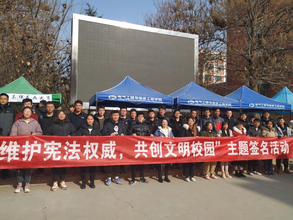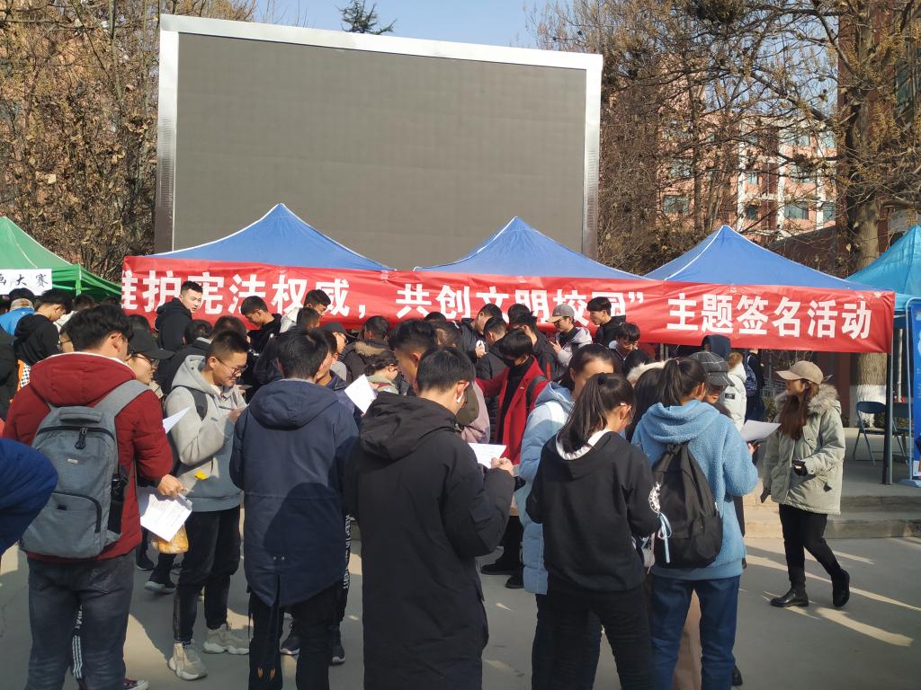 为增强法治观念,推动师生树立宪法意识,2019年12月4日,电信公司于彭家坪校区红柳广场举办“维护宪法权威,共创文明校园”主题签名活动。