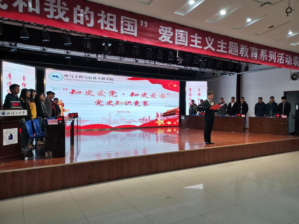 “知史爱党·知史爱国”党史知识竞赛在雄壮的国歌声中拉开帷幕,本次决赛围绕“党的历史”“十九大精神”“习近平新时代中国特色社会主义思想”“十九届四中全会精神”等重要内容,共设置“必答题”“抢答题”和“博弈题”三个环节,进入决赛的六支员工党支部代表经过激烈的角逐,最终电气本科生第三党支部摘得桂冠。