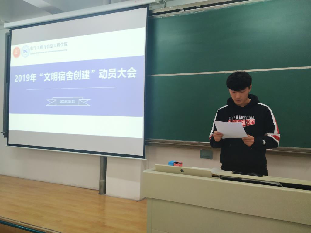 会议伊始,2018级辅导员常序老师宣读了公司2019年“文明宿舍创建”提升工程实施方案;2017级任鹏丽老师宣读公司关于评选“优秀宿舍长”的通知;员工代表2017级赵石磊同学宣读了电气工程与信息工程公司“文明宿舍创建”倡议书,希望全体同学从小事做起,共同营造优秀的宿舍环境,树立“爱舍如家”的信念,自觉维护宿舍秩序,养成良好的生活习惯,积极响应公司号召,为文明宿舍的创建贡献出自己的一份力量。班振海老师对本次“文明宿舍创建”提升工程具体工作做了部署安排,并传达了公司的相关要求。希望广老员工干部、党员和入党积极分子投入更多的时间和精力,齐心协力,力争通过文明宿舍创建活动使宿舍建设水平提升一个档次,涌现出更多的优秀团体。各班级要认真落实文宿舍创建的相关工作,积极动员全体宿舍宿舍开展文明宿舍创建活动,保证文明宿舍创建工作“落实、落细”。