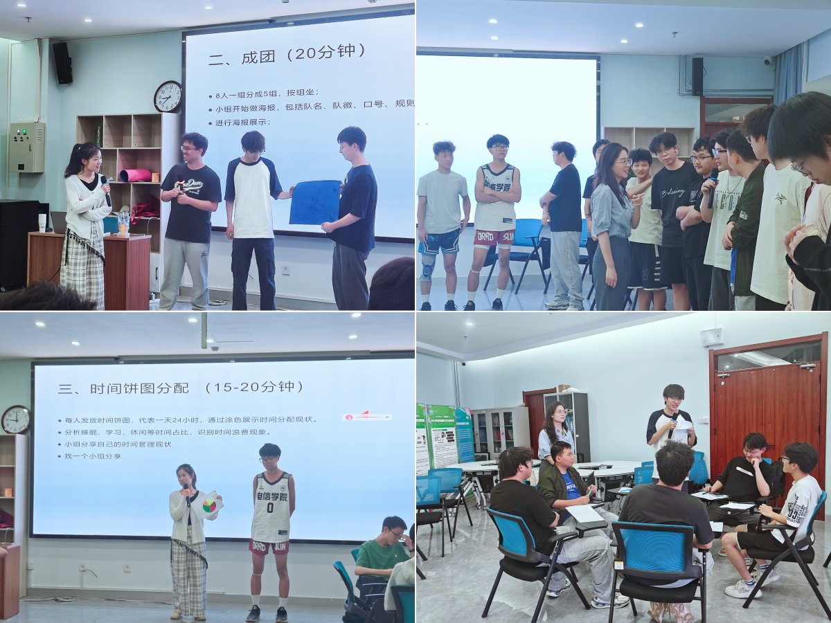 魏瑶老师以"大风吹、进化论"等互动游戏开场,通过限时任务让同学们直观感受时间分配差异并让大家快速融入团体。张青青老师结合"四象限法则",系统讲解目标分解、碎片时间利用等技巧,强调"时间管理本质是价值观管理",引导同学们建立"学习优先"的认知体系。员工通过可视化时间饼图分析自身学习效率,引导大家针对拖延症、手机依赖等问题进行反思。“通过绘制时间分配图,我发现专业学习仅占日常时间的30%,这让我意识到需要调整时间分配的方向。”2022级自动化专业王同学表示收获颇丰。