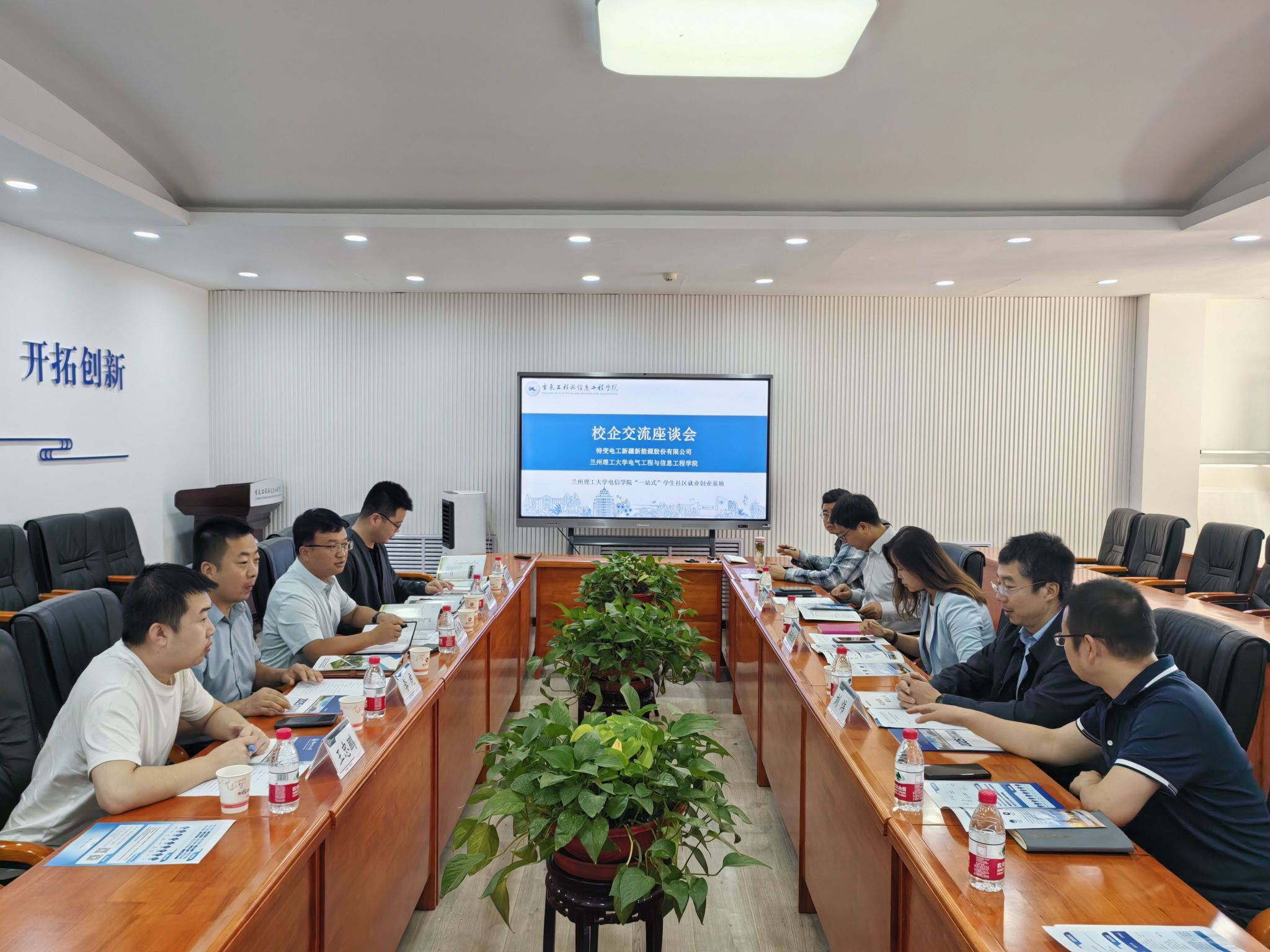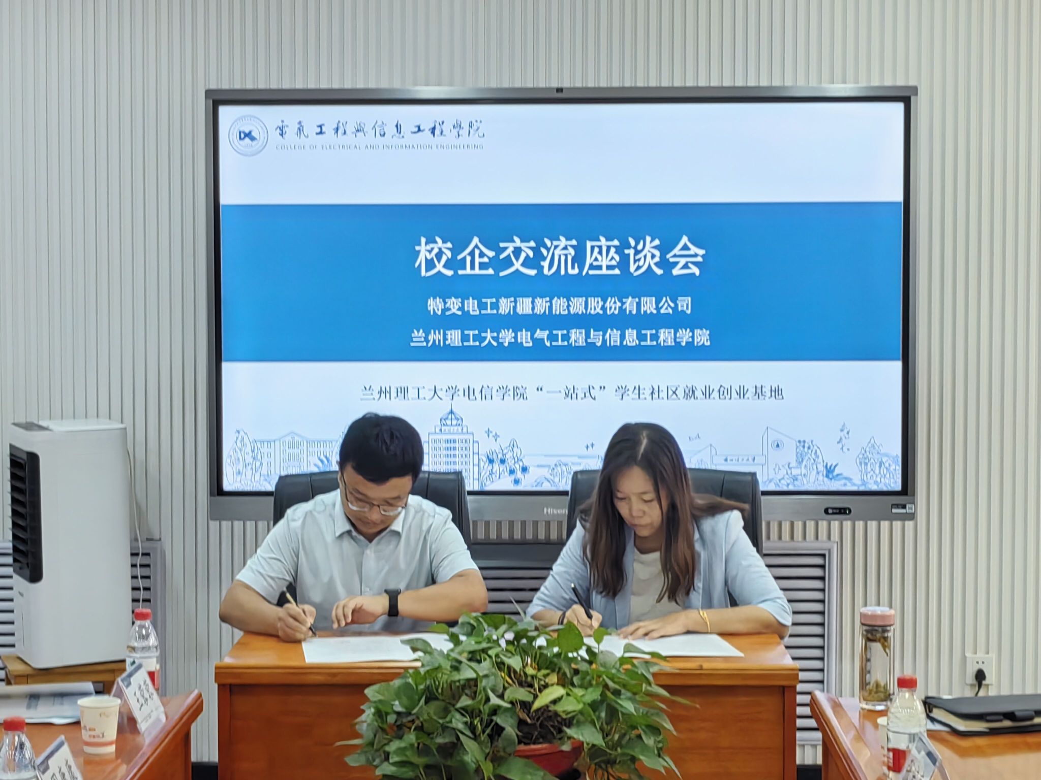 杨雅琼对特变电工新疆新能源股份有限公司一行来校座谈交流表示热烈欢迎,同时介绍了公司的发展历史、专业设置、校企合作情况;张宏亮就公司团队队伍、学科方向、科研特色、实验室建设等进行了介绍;刘炜结合目前毕业生的就业去向、员工就业实践基地建设等相关事宜做了详细的解释,并谈到,特变电工历来都是公司毕业生就业的热门企业,希望今后双方能够加强合作,继续扩大合作成果。特变电工新疆新能源股份有限公司李虎汇报了企业目前的发展现状、科研业务合作等工作。与会双方现场签订毕业生就业基地建设合作协议书。
