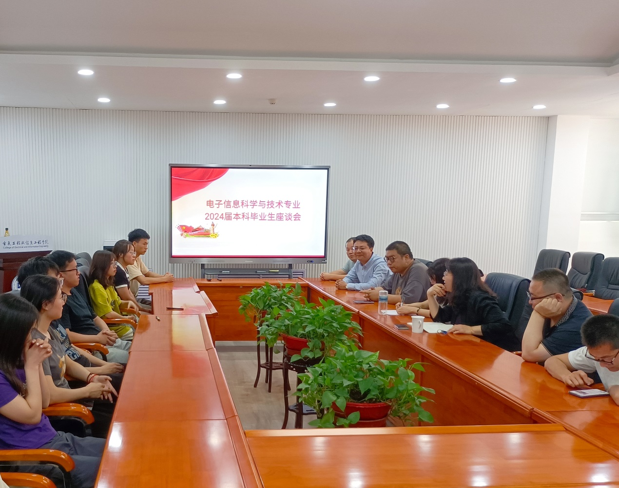 2024年6月13日,电信公司在彭家坪校区舒卷楼会议室召开了电子信息科学与技术专业2024届毕业生代表座谈会。电信公司副经理张宏亮,系主任黄玲,专业课老师代表,辅导员老师代表,班主任老师及二十余名毕业生员工代表等出席了会议,系主任黄玲老师主持了会议。