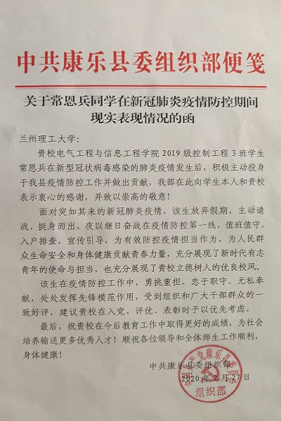 不忘初心,勇担使命。在全民抗疫的非常时期,电信公司研究生积极响应公司疫情防控小组的倡议,奋力投身各地疫情防控攻坚战中。近日,公司收到康乐县委组织部来函,对电信公司2019级控制工程专业研究生常恩兵同学,在疫情防控工作期间,主动请战,勇于分担防疫任务的现实表现进行了认定。