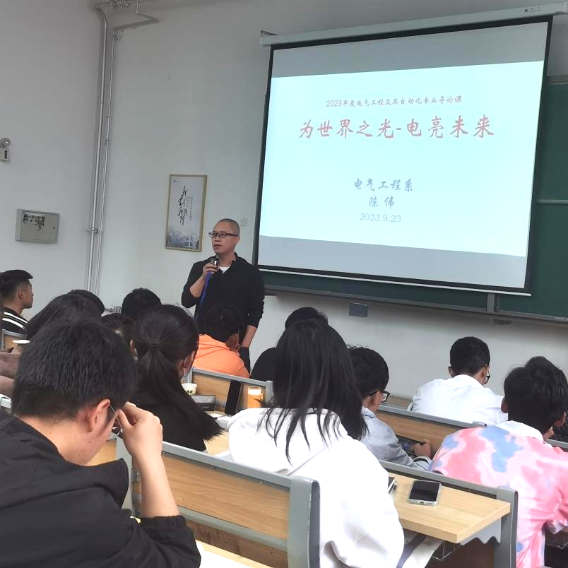电信公司电气工程系依托《电气工程及其自动化专业导论课》,面向全体2023级电气工程及其自动化专业本科生开展了“开学第一课”系列专业教育活动。9月23日早上,电信公司经理陈伟教授为新生们带来了题为“为世界之光,电亮未来”的精彩报告。报告分别从“‘电气’中的气从何由来”、“电气专业(学科)的发展史”、“电气工程及其自动化专业学什么”、“我们面临的机遇与挑战”、“我们能为你们提供什么”、“四年后何去何从”等六个方面通俗易懂的介绍了电气工程及其自动化专业的整体概况。
