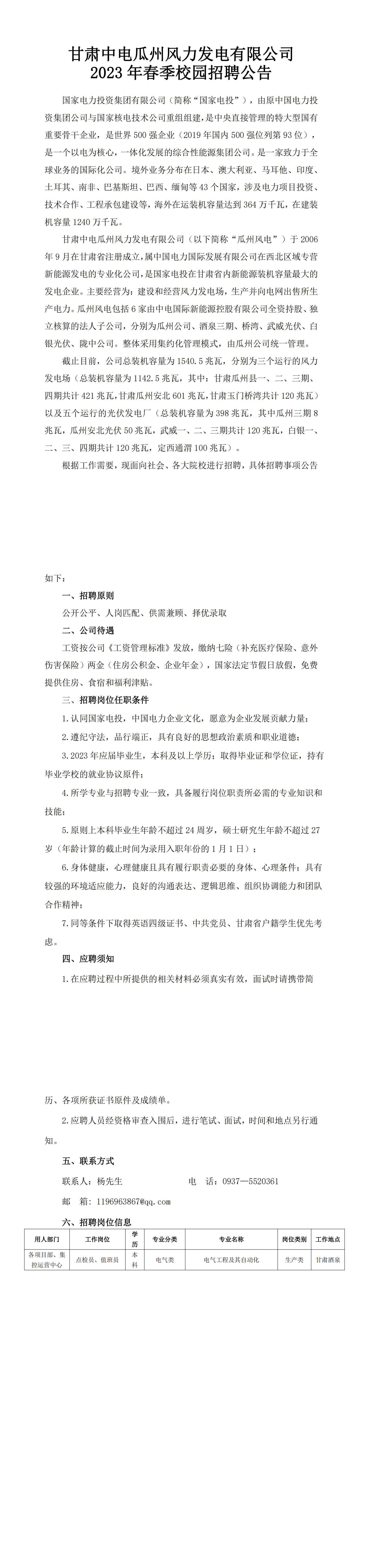 甘肃中电瓜州风力发电有限公司2023年春季校园招聘公告