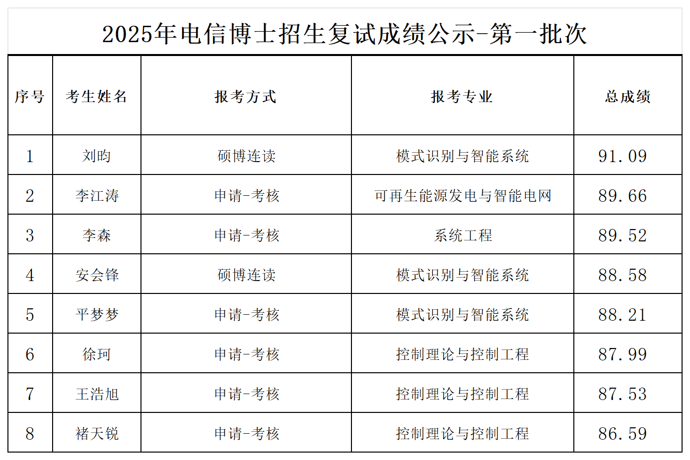 根据金沙城js93线路检测中心研究生院《2025年第一批博士研究生招生报名的通知》和《电信公司2025年第一批博士研究生招生复试录取实施细则》的文件要求,经导师初审、公司资格和材料审核、公司综合考核, 现对考生的总成绩进行公示。如对总成绩有异议,可向电信公司、研究生院反映。公示时间: 2024年12月12日至2024年12月14日