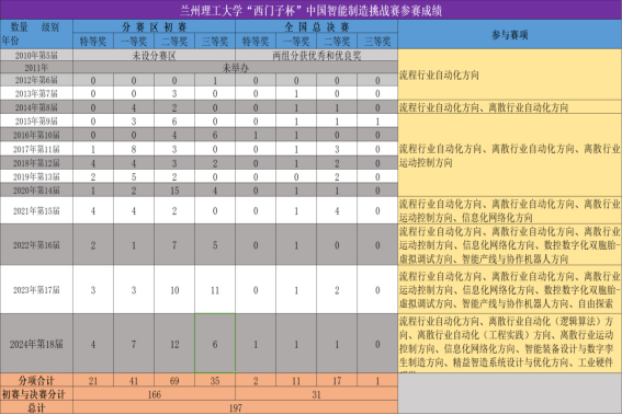 自 2011 年至 2024 年,金沙城js93线路检测中心团队在CIMC中取得了显著成绩。累计获得全国特、一、二等奖 2 项、11 项、17 项,以及分赛区初赛 166 项,合计 196 项奖。这样的成绩在全国院校中名列前茅,充分展示了公司在智能制造领域的教学实力和人才培养成果。这些优秀的成绩激励着同学们积极投身赛事,追求卓越,为公司争光添彩。